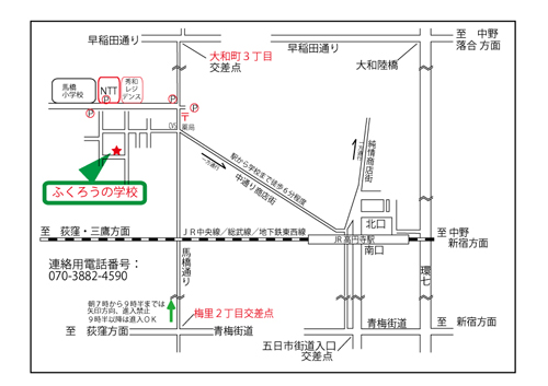 ※JR高円寺駅改札を出て左側北口に出てください。出たらすぐに左折。そのまま直進し、横断歩道を渡ってセントラルロード(仲通り商店街)に入り、ひたすら直進してください。商店街つきあたりまでいくとコンビニのローソンがあります。そのローソンの左側の道に入り、さらに直進です。その後2つめの十字路を左に折れ、直進。初めてのT字路を右に折れます。そのまま30m程度先の右側がふくろうの学校になります。